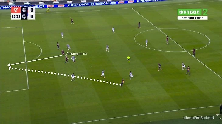 Когда «Барселона» атаковала через фланги, Левандовски разнообразно искал пространство. Он резко нырял на ближнюю штангу, по дуге заходил на дальнюю или ловил защитников на движении к воротам и оставался под катбэк.