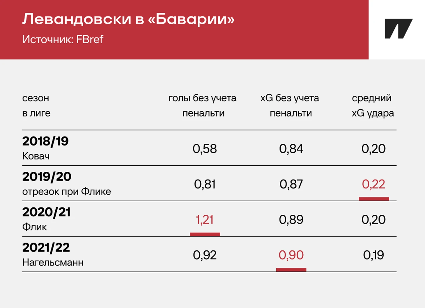 Любопытная тенденция: при Флике Левандовски стабильно получает много моментов и забивает больше ожидаемого или на уровне. Так было далеко не с каждым тренером (например, при Коваче или в последний год Хави).