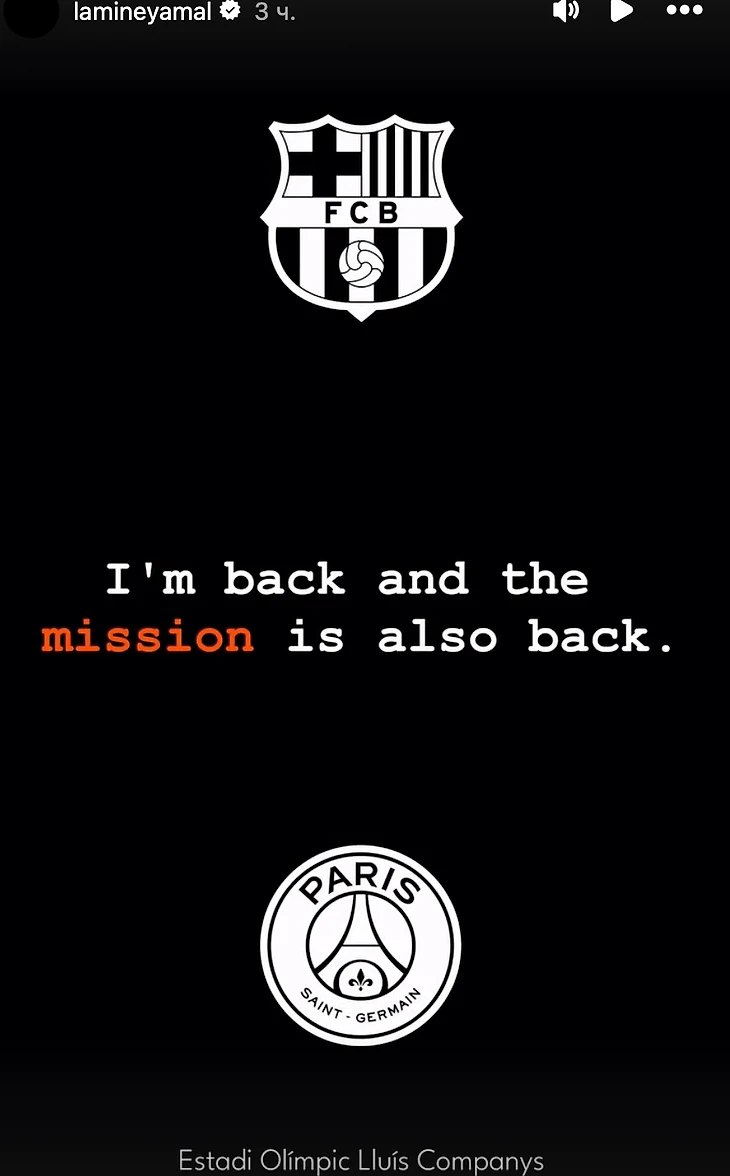 Вчера защитник «ПСЖ» Ашраф Хакими сказал, что Ямаля ждет встреча с лучшим левым защитником мира – Нуну Мендешем. Ямаль отреагировал эпичной нарезкой с речью Аль Пачино, которая оканчивается словами: «Я возвращаюсь. Моя миссия – тоже».