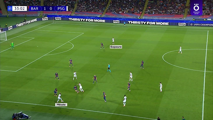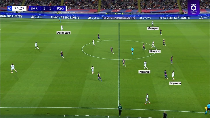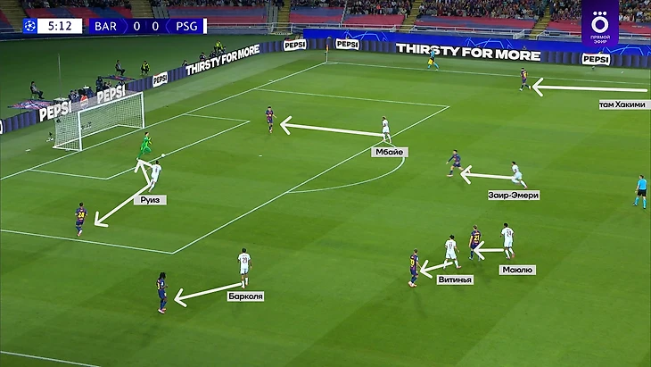 В обороне «каталонцы» делали акцент на левом краю соперника, ведь именно там со стартовых минут действовала главная сила «ПСЖ» — Брэдли Барколя. Против него Флик не постеснялся сдвоить фланг: