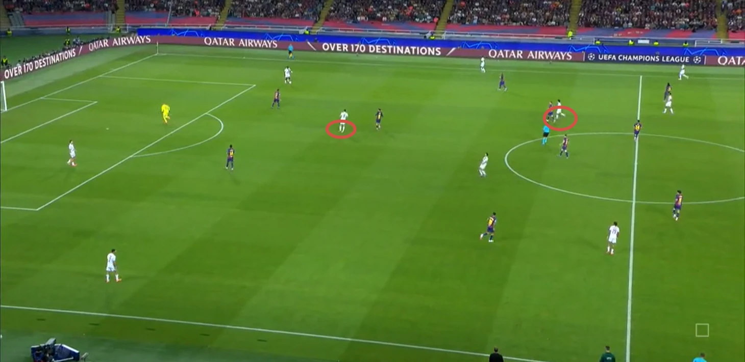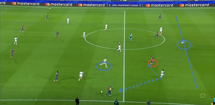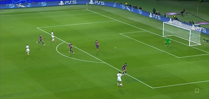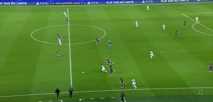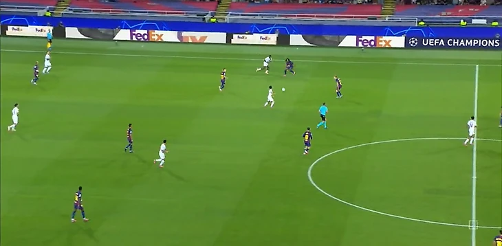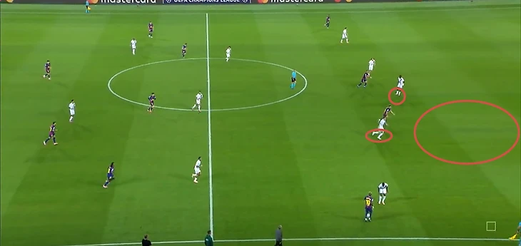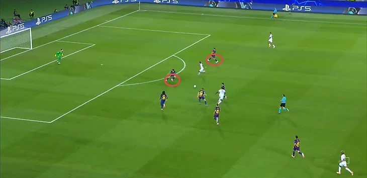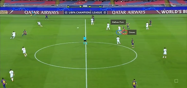 Нападающий «парижан» беспрепятственно принимает мяч между двумя центральными защитниками «каталонцев» и разворачивается, а далее еще совершает передачу без давления.
