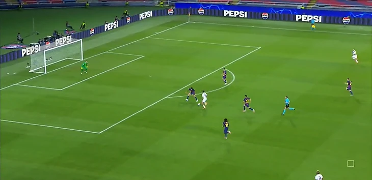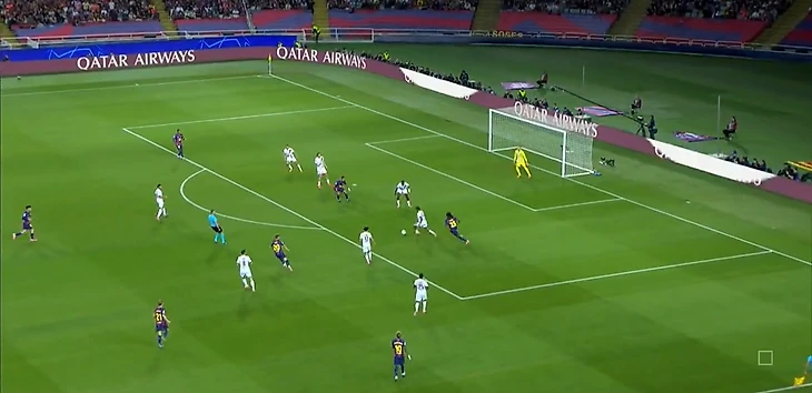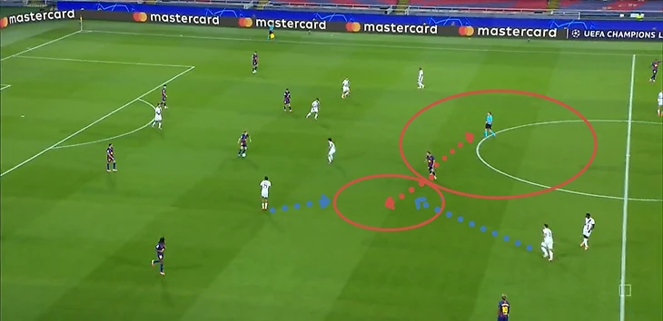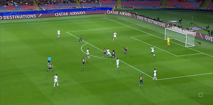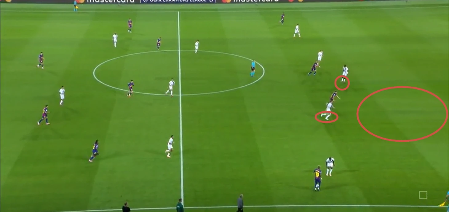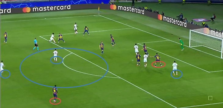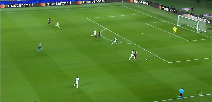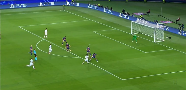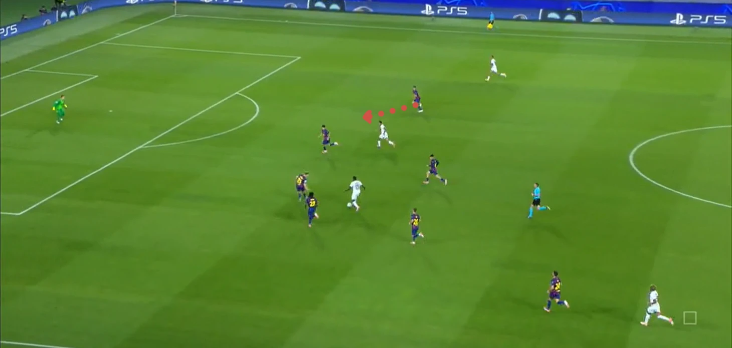 Нападающий «парижан» беспрепятственно принимает мяч между двумя центральными защитниками «каталонцев» и разворачивается, а далее еще совершает передачу без давления.