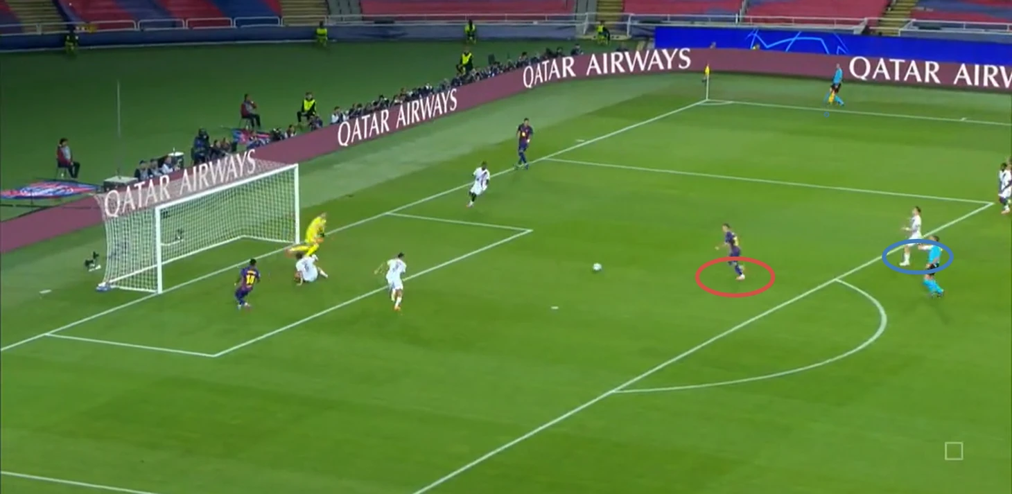 Решающий мяч Рамуш забил после неудачного высокого прессинга «сине-гранатовых» в момент, когда «Барселона» восстанавливала структуру обороны (Кубарси вышел непозволительно высоко, как для центрального защитника, чтобы встретить соперника, в этот момент его зону прикрывал Бальде), совершив «движение Анри». Недавно нашумела аналитика французского нападающего по грамотному позиционированию форварда в положении вне игры и моменту включения в эпизод (советую отдельно найти разбор).