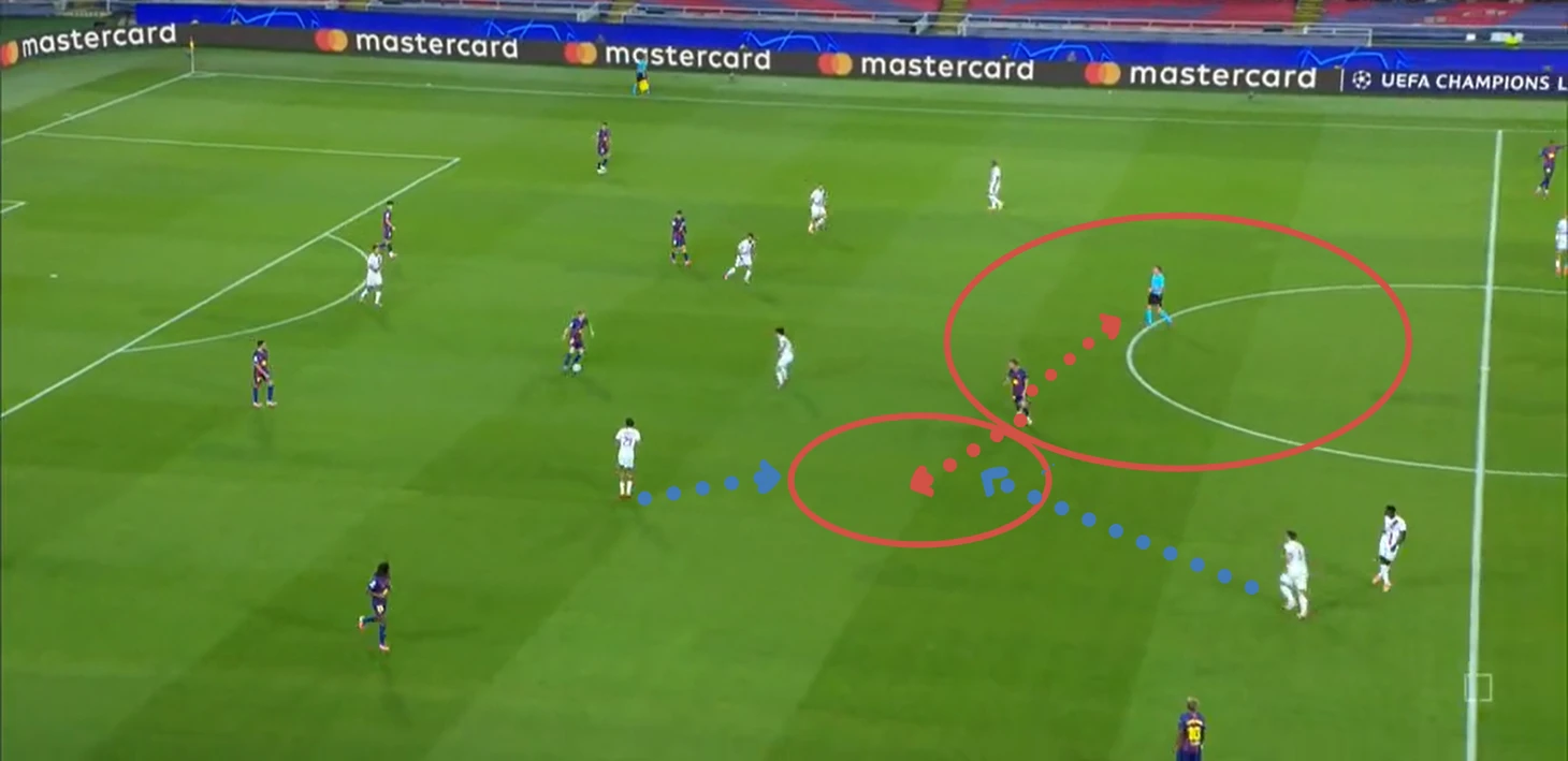 Ситуативно прессинг «ПСЖ» все же работал в первом тайме. Важно отметить, что команда играла зонно-персональный прессинг, передавая игроков (во втором тайме – строго персональный), что имело свои успехи, но и недостатки. В купе с динамичными позициями Педри и Де Йонга, скоростью того, как они разворачивают мяч и ищут зоны, игроки «ПСЖ» все время отставали на темп, полтемпа. Безусловно, отсутствие Дембеле – сильный удар не только при игре команды с мячом, но и игре команды без мяча – именно он был тем игроком, который задавал «темп» и «ситуацию» прессинга.
