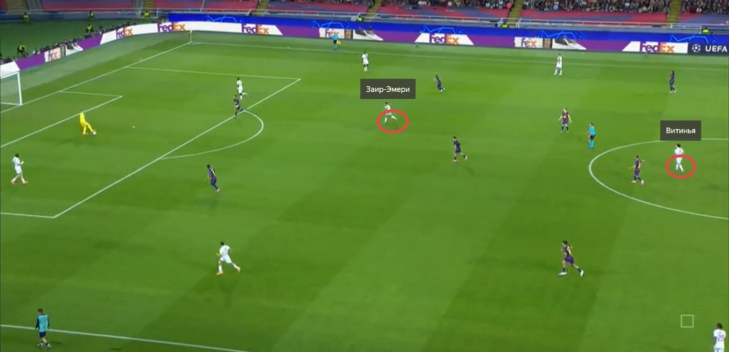 Стоит отметить провалившийся прессинг «парижан» – Витинья выдернулся из своей зоны, оставив за собой гектары пространства, а с учетом того, что Де Йонгу ничего не мешало отдать передачу в свободную зону (он уже поднял голову и не находился в состоянии единоборства), оценить данное решение иначе, как крайне опрометчивое, невозможно. Руис не успевает взять своего игрока после того, как страховал позицию Мендеша, после чего пытается наверстать и выбрасывается как Серхио Рамос (но не как в лучшие годы), из-за чего его отыгрывают передачей. Паччо создает пространство как для Ольмо (низко встречает), так и для Феррана (ломает офсайдную линию для забегания по диагонали), а Мендеш не может сыграть в прием с Ямалем, иначе его легко отыграют передачей, из-за чего португальский защитник остается в полупозиции с извечным вопросом: что делать?