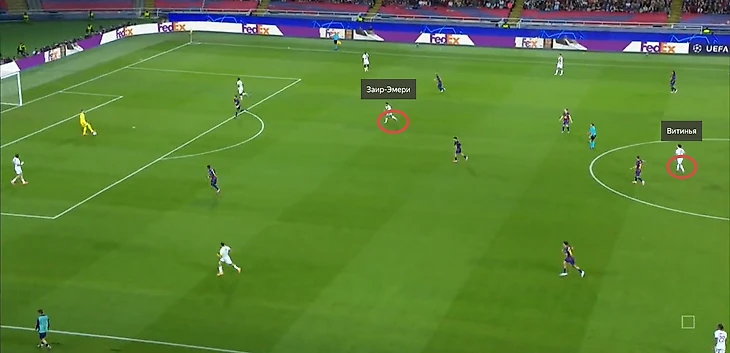 «Барселона» более грамотно подготовилась к «билдапу» «ПСЖ». Из работающих механизмов можно выделить: отличную коллективную работу Ольмо-Торреса по Витинье (здесь также стоит отметить отсутствие Жоао Невеша, с которым у португальского «метронома» образуется «особая синергия». Игроки «телепатически» чувствуют, когда необходимо поменяться ролями при «билдапе», в какие зоны лучше открыться, также Невеш создает большинство в зоне владения, выигрывает огромное количество единоборств и грамотно закрывает недостатки своего партнера. Заир-Эмери способен качественно выполнять роль Невеша, но таким же «чутким» взаимопониманием с Витиньей не обладает) педантично и грамотно отрезающих возможные коридоры для продвигающих передач, из-за чего португальский полузащитник совершал непростительные для себя ошибки в передачах, либо «сомнительное» продвижение мяча на владении вдоль поля.
