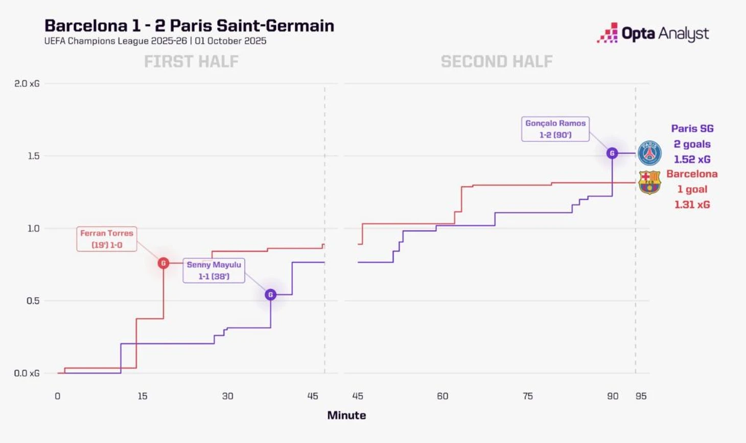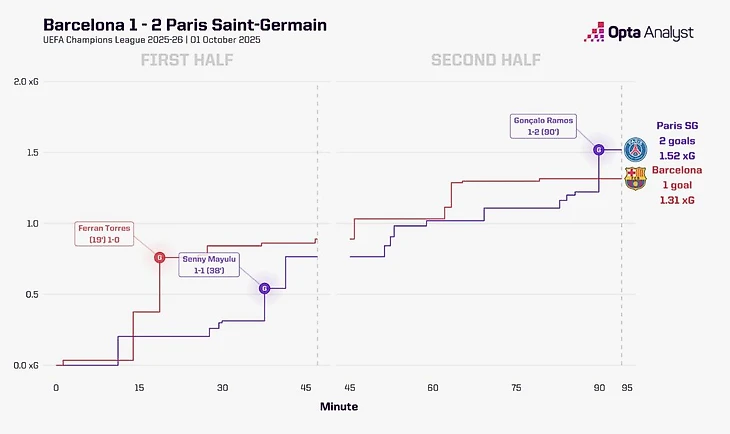 Если спросить своего собеседника: каким способом «Барселона» может открыть счет в матче? Собеседник с высокой долей вероятности предположит версии с красивым розыгрышем или завораживающим индивидуальным проходом… Стоит добавить контекст: «Барселона» Ханси Флика, и сразу появляется еще один фаворит – в результате контрпрессинга. Именно так был забит первый мяч в данной встрече. После отбора Витинья замешкался, и игроки «Барселоны» перекрыли основные коридоры для передачи, создав ситуацию для ошибки. Безусловно, португалец в немалой степени сам принял не самое очевидное решение, но не стоит отбрасывать контекст (почему он принял именно это решение). Далее, «каталонцы» грамотно разыгрывают «атаку веером». Стоит отметить ужасную позиционную игру Хакими, который сначала играл не по игроку и не по пространству, ориентируясь только на мяч, чем просто продублировал позицию Забарного, запустил Рашфорда за спину, а следом сломал офсайдную линию команды. Не лучшим образом сыграл и португальский защитник, решив не доигрывать эпизод, а понадеяться на офсайд, времени ему хватало, чтобы выиграть позицию у Торреса, и по итогу стоит отметить главного бенефициара эпизода – Ферран сыграл как образцовый нападающий, выдержав офсайдную линию.