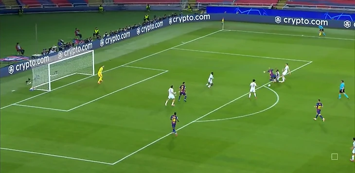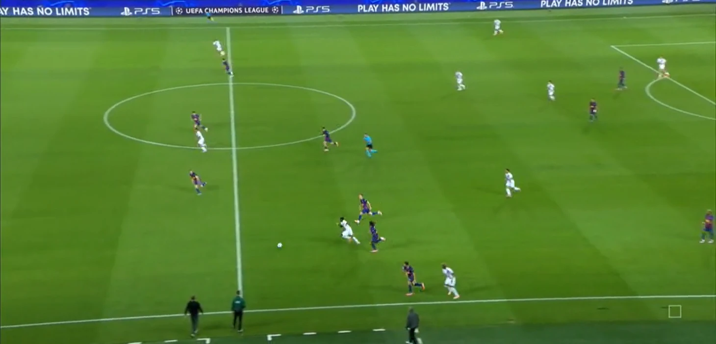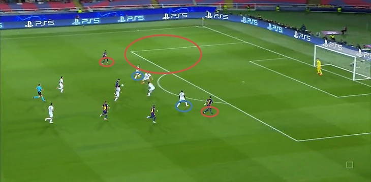 Ответный мяч «ПСЖ» пришел уже после фланговой ротации вингеров. Мендеш отлично поймал на опорной Кунде, отыгравшись с партнером, устранив еще и страхующего Кунде Гарсию. По цепочке зону Гарсии «сел» Де Йонг, из-за чего у Мендеша появилось пространство для разбега в центре поля. Кубарси плассировался, но не совсем корректно оценил пространство, открывая прямой коридор для Маулу. Также нельзя обойти Мартина, который не сужает и создает зону в центре для соперника, забывая об одном из главных правил: между центром и флангом необходимо выбирать центр, откуда гораздо больше возможностей забить гол.