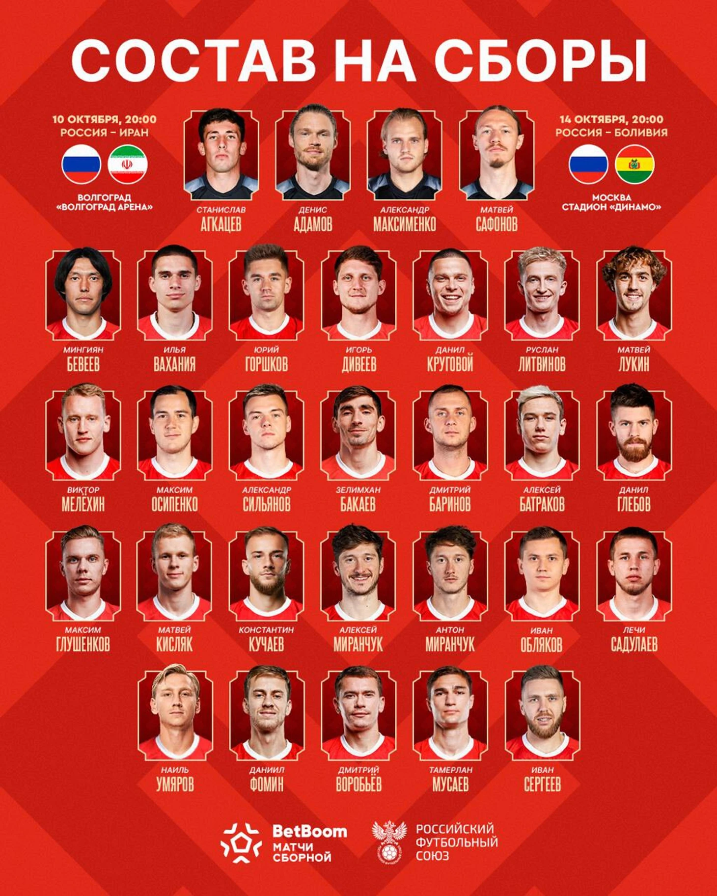 Ранее был назван расширенный состав, где было 42 игрока. В нем были Арсен Захарян, Александр Соболев, а также три представителя лучшей обороны РПЛ прямо сейчас: вратарь Максим Бориско, защитники Владислав Саусь и Мингиян Бевеев из «Балтики».