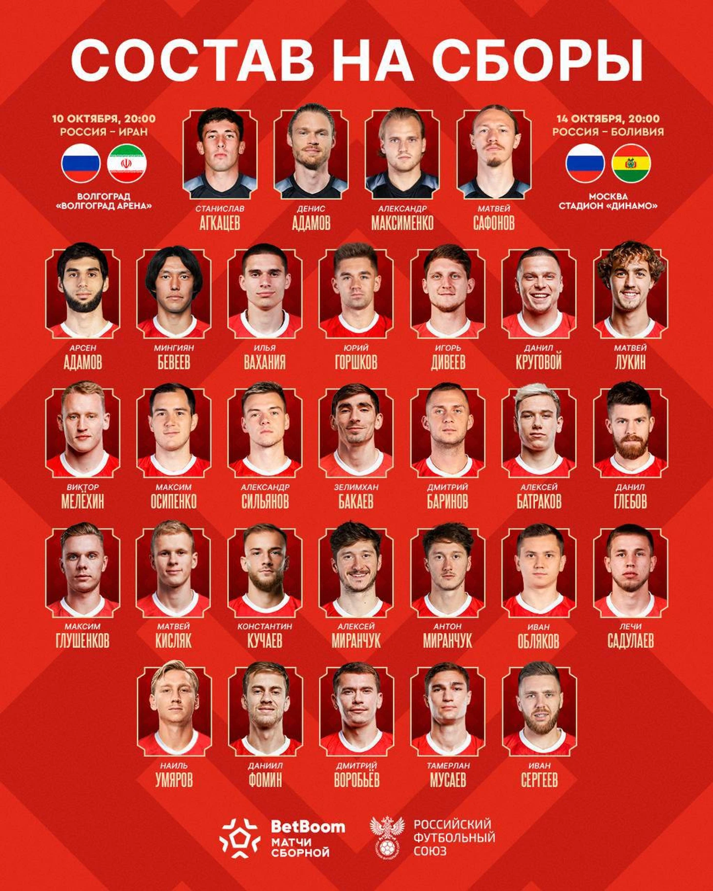 Валерий Карпин назвал состав сборной России на матчи с Ираном (10 октября) и Боливией (14 октября). В него вошли 30 футболистов, в том числе пять из «Динамо».