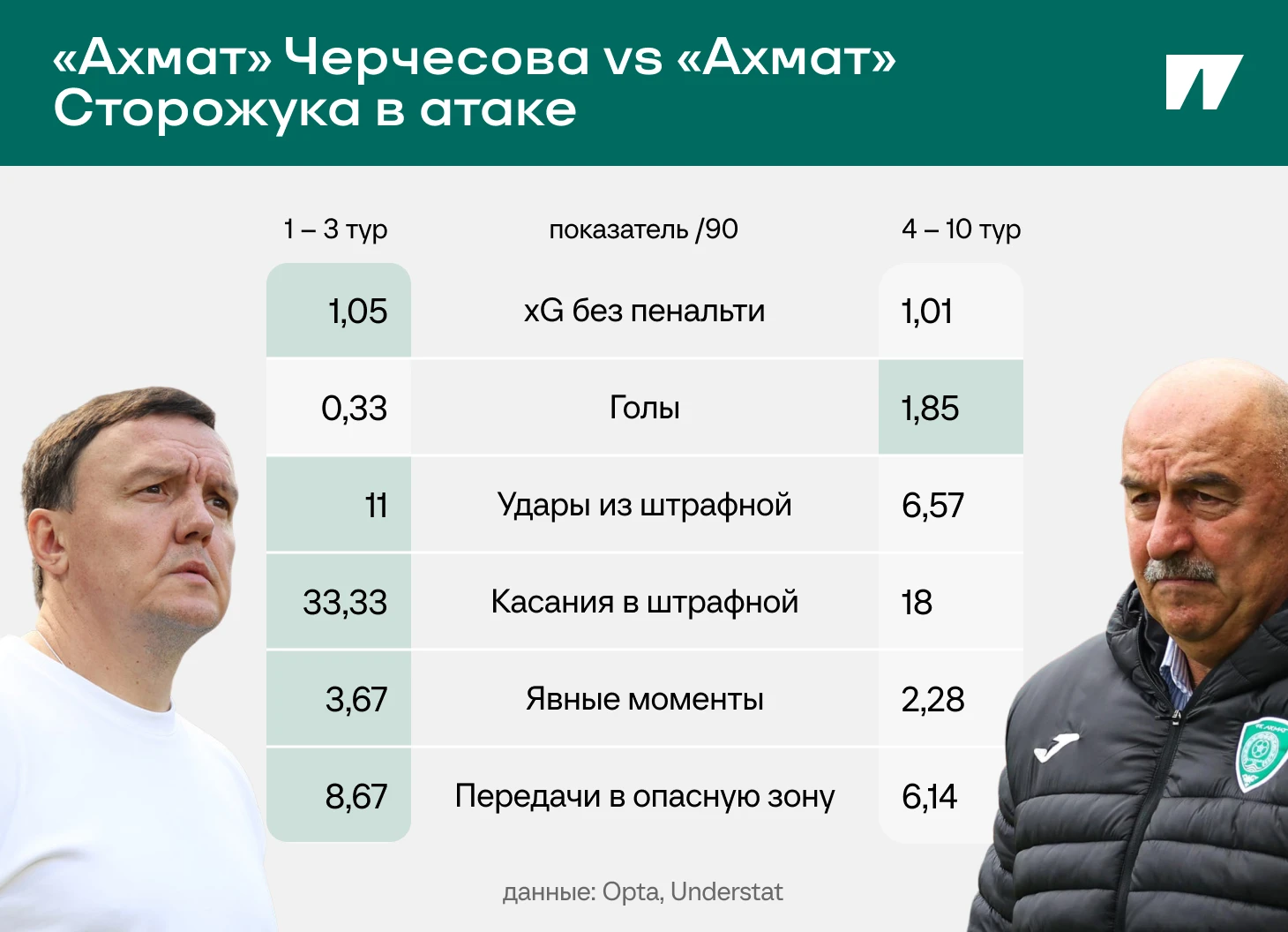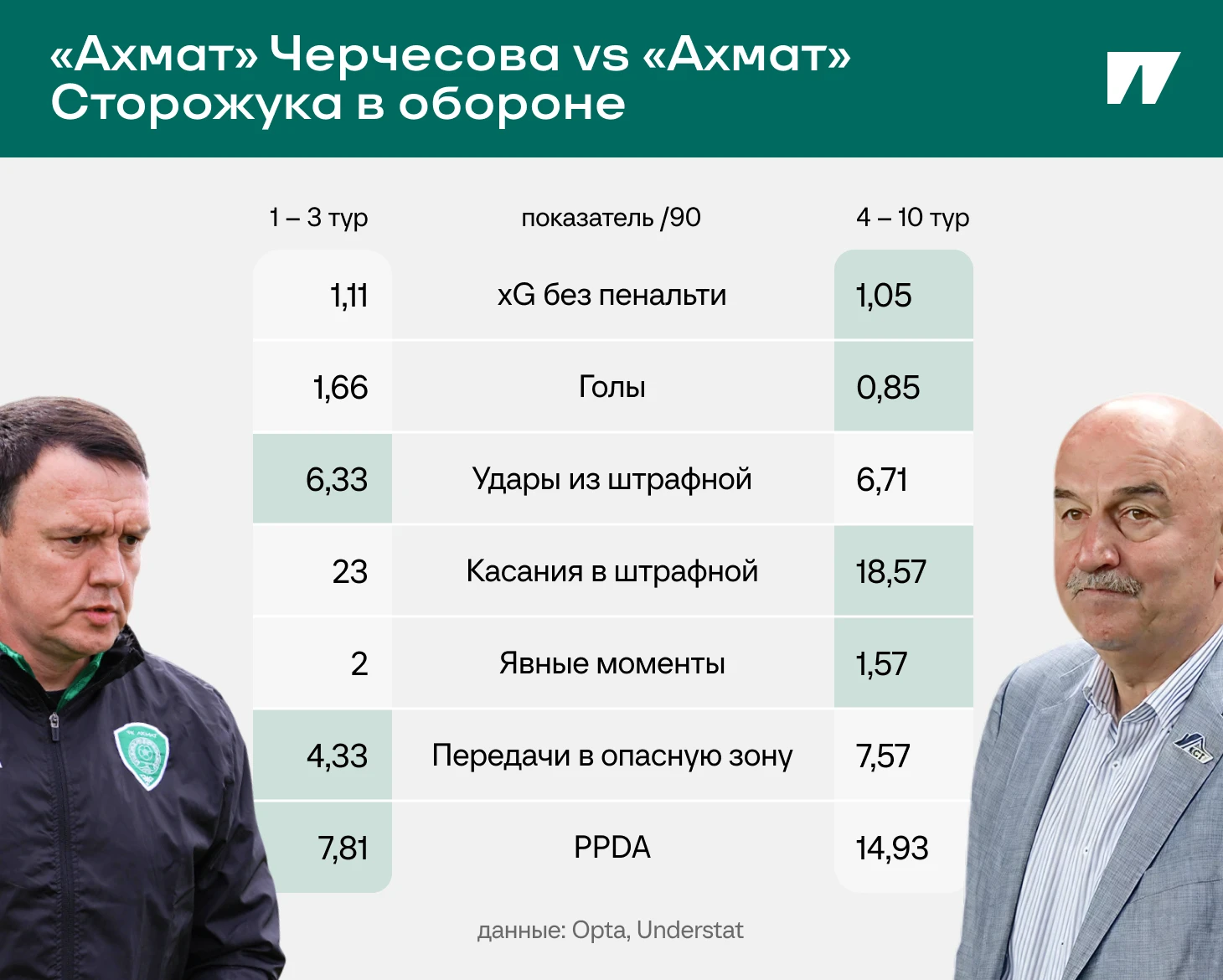 Во-вторых, перенастроил стиль. «Ахмат» дисциплинированно откатывается назад и не бежит прессинговать как раньше (16-е место по интенсивности давления при Черчесове). За счет этого допускает меньше провалов и лучше обороняется.