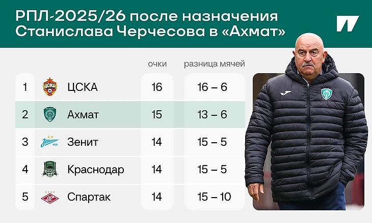 Черчесов ни разу не проиграл в первых семи матчах РПЛ после назначения – первый тренер в истории «Ахмата» с таким достижением. Еще выгоднее Черчесов выглядит на контрасте с предшественником: при Александре Сторожуке клуб застрял на дне таблицы с нулем очков после трех туров, после трети чемпионата – всего в 3 очках от топ-5.