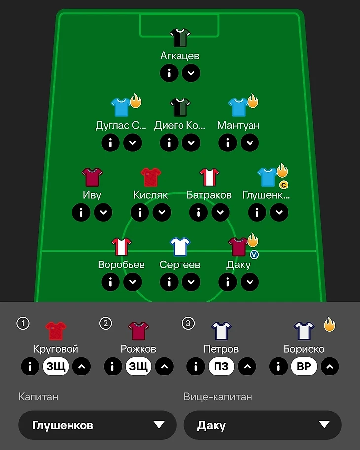 Глушенков вместо Облякова - дискуссионный момент на самом деле. Ведь Обляков исполняет пенальти в ЦСКА. Но Макс вроде в форме, не знаю насколько его хватит, конечно. Ну и учитывая покер в предыдущем туре, сомневаюсь, что «Акрону» он забьёт - для фэнтези он будто максимум выжал в прошлом туре. Но есть статистика и уровень ближайших соперников. Беру пока прёт, а там видно будет.