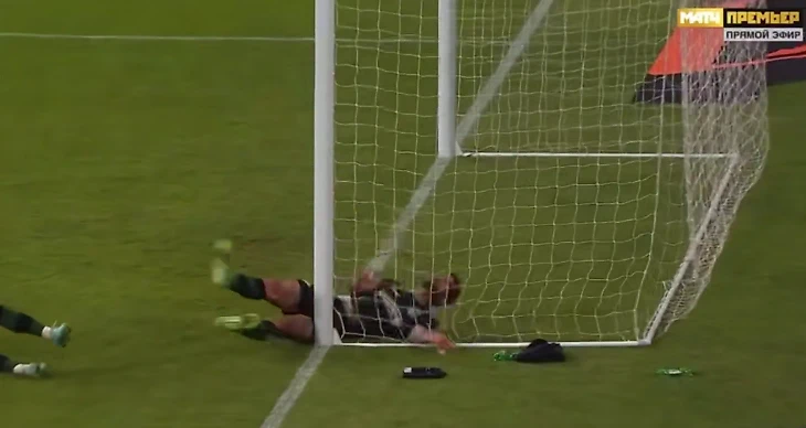 Нападающий пробивал в нижний, но Витор Тормена успел к ленточке – и в падении выставленной ногой отбил мяч в штангу. Фантастическое спасение.