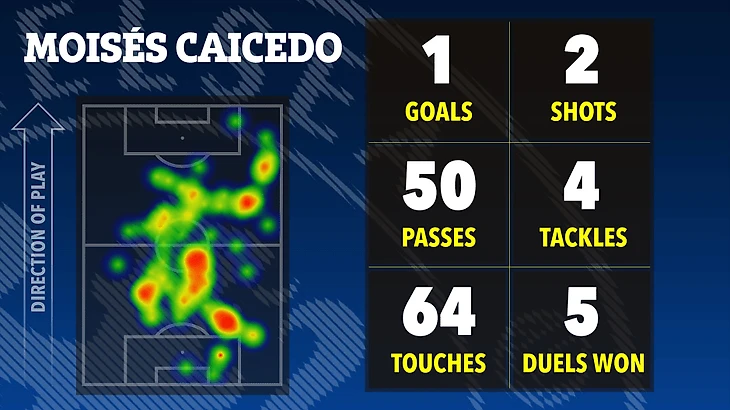 Матч Челси начал очень бодро к середине тайма завалил гол Кайседо, в девятку! Мне многое нравится в Мозесе и в том числе поставленный плотный удар. Он не часто бьёт по воротам, должность на поле не та. Но если бьёт, это всегда опасно и как правило заканчивается в нашу пользу. Кайседо кстати стал лучшим бомбардиром Челси в этом сезоне - 3 гола.