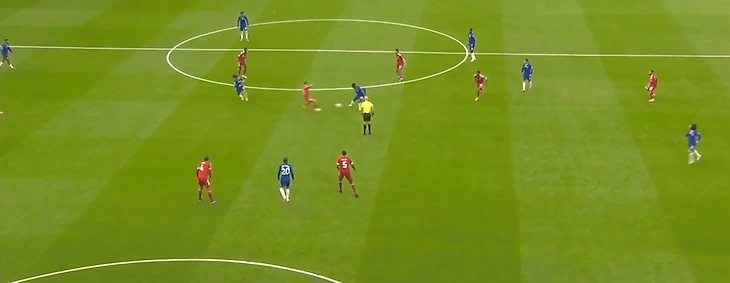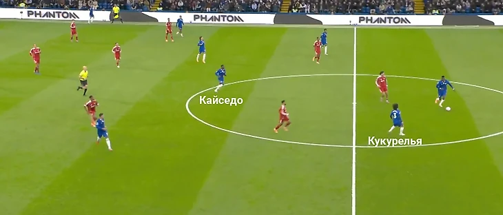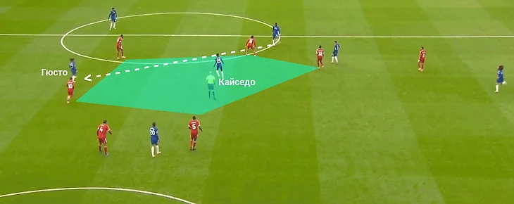 Марк, как и в моменте с голом, снова видит Кайседо в опорной зоне без опеки, поэтому и идет к мячу, чтобы сохранить нужный угол передачи для возможного паса на Мойзеса