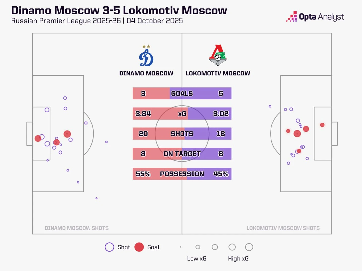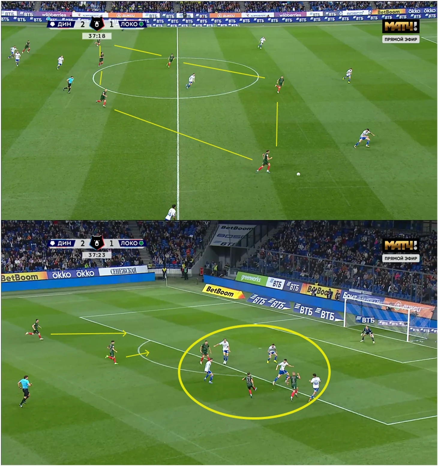 Вторая проблема – неустойчивость к контратакам. Подробную экспертизу по ней давал Роман Шаронов: «Динамо» не структурировано и не готово к потере мяча. «Локомотив» постоянно переходил в быструю атаку, имея численное преимущество. Неприятное соотношение добивал тотальный рассинхрон.