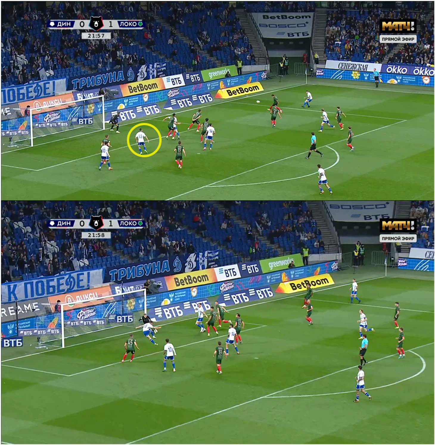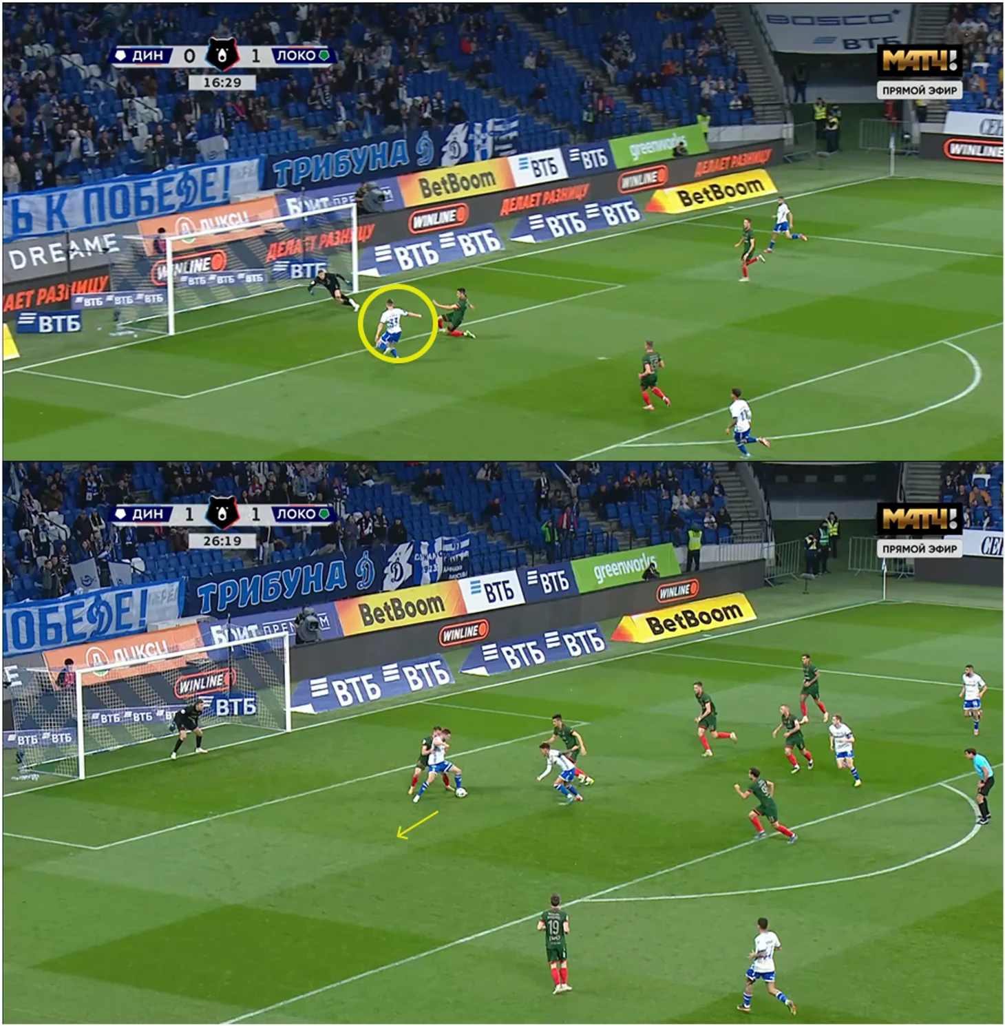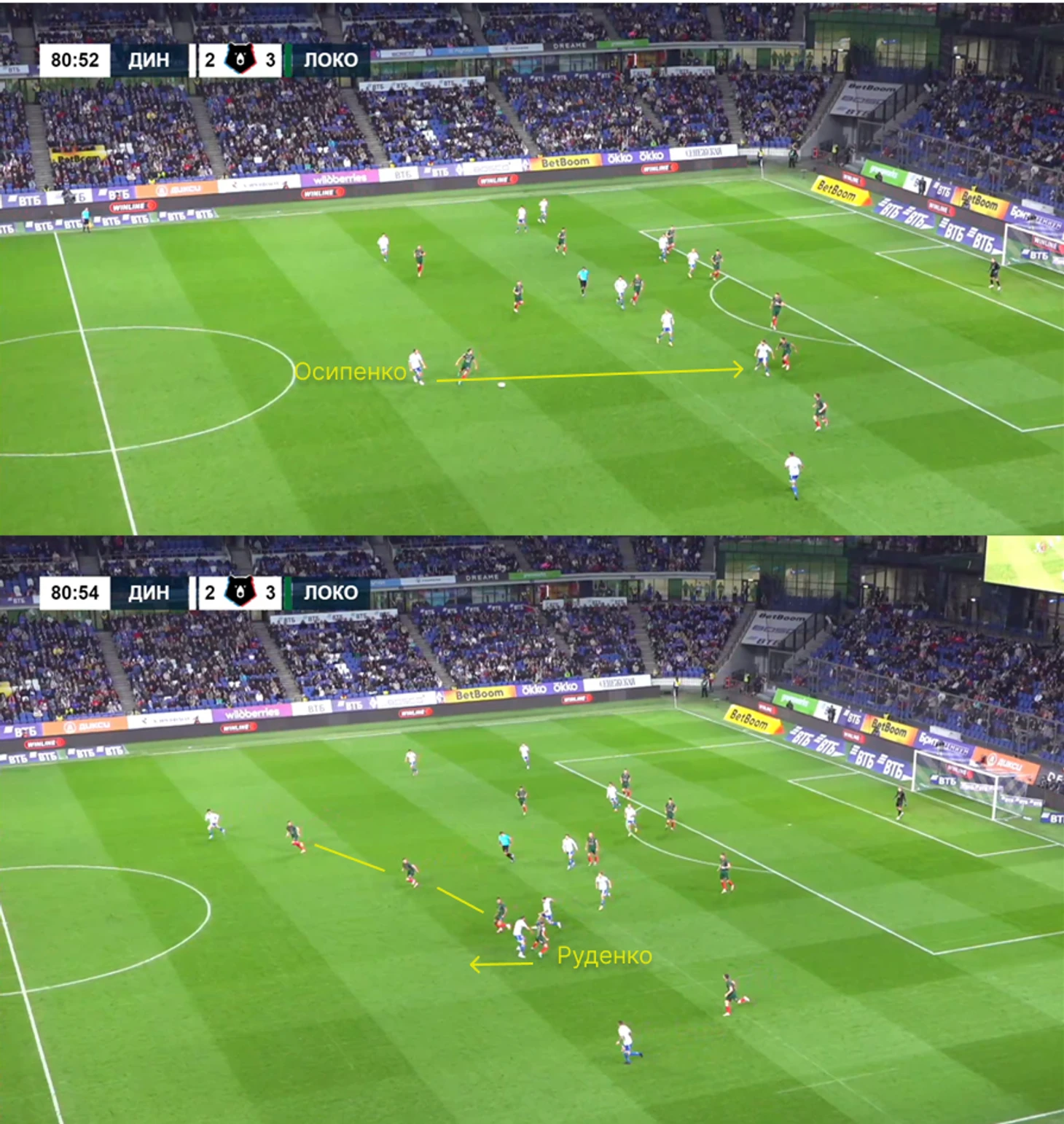Радикальная смелость порой противоречит здравому смыслу. Похожие выпады команда Карпина допускала со «Спартаком» и «Крыльями». «Динамо» всем составом на чужой половине, при этом у Осипенко только сложные варианты для продолжения атаки. Любой пас в правую сторону – триггер к давлению. Сразу три игрока «Локо» могли вылетать за четвертым голом на 5 секунд раньше, если бы Осипенко не перехватил пас Руденко.