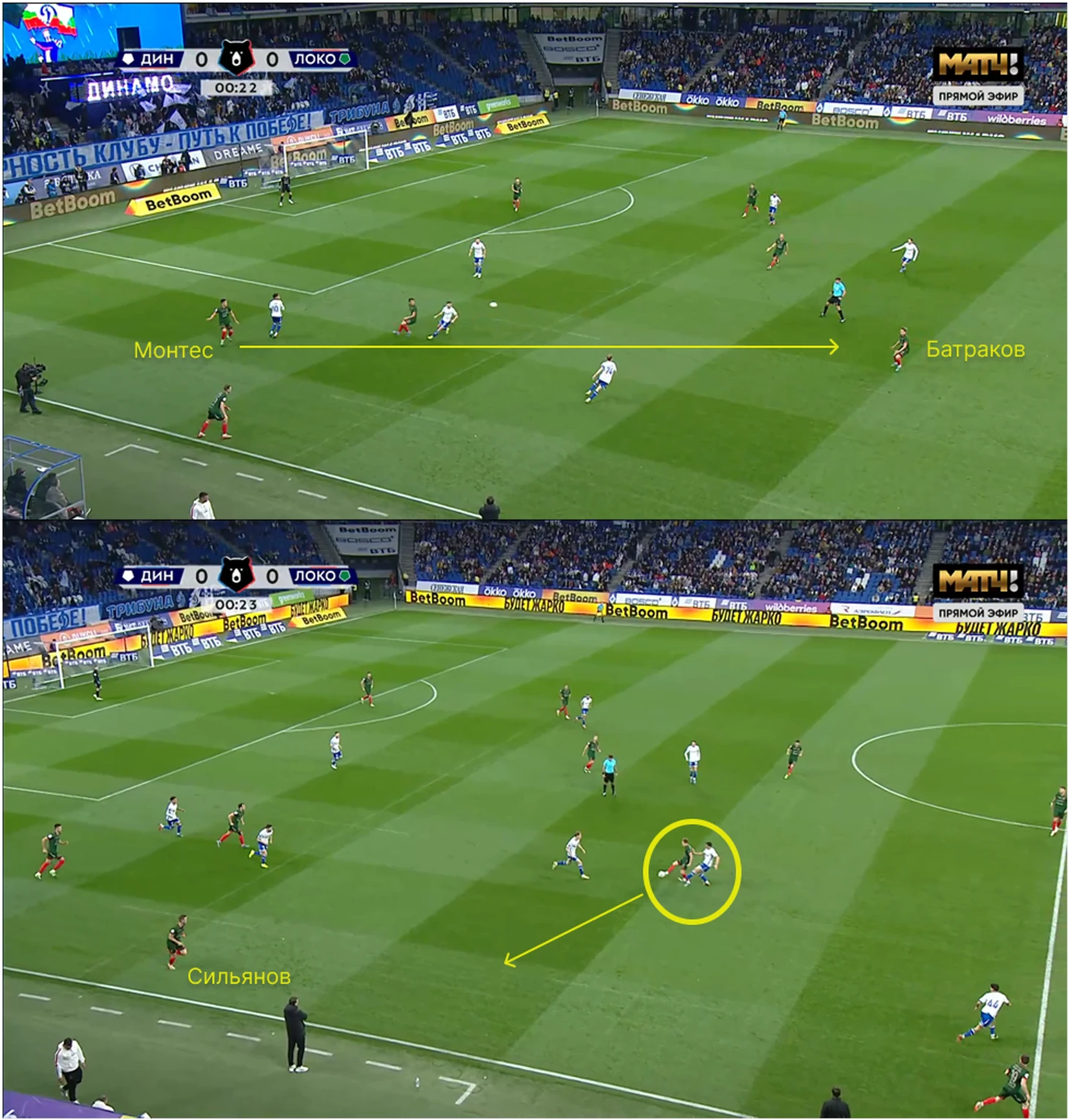 Оборона «Локо» тоже трещала. «Динамо» отвечало атаками Ивана Сергеева, креативом Бителло и Миранчука и подачами Хуана Касереса. Сергеев уничтожал Монтеса рывками из-за спины. Так вываливался один на один после проникающего паса Миранчука и замыкал на дальней прострел Маухуба.