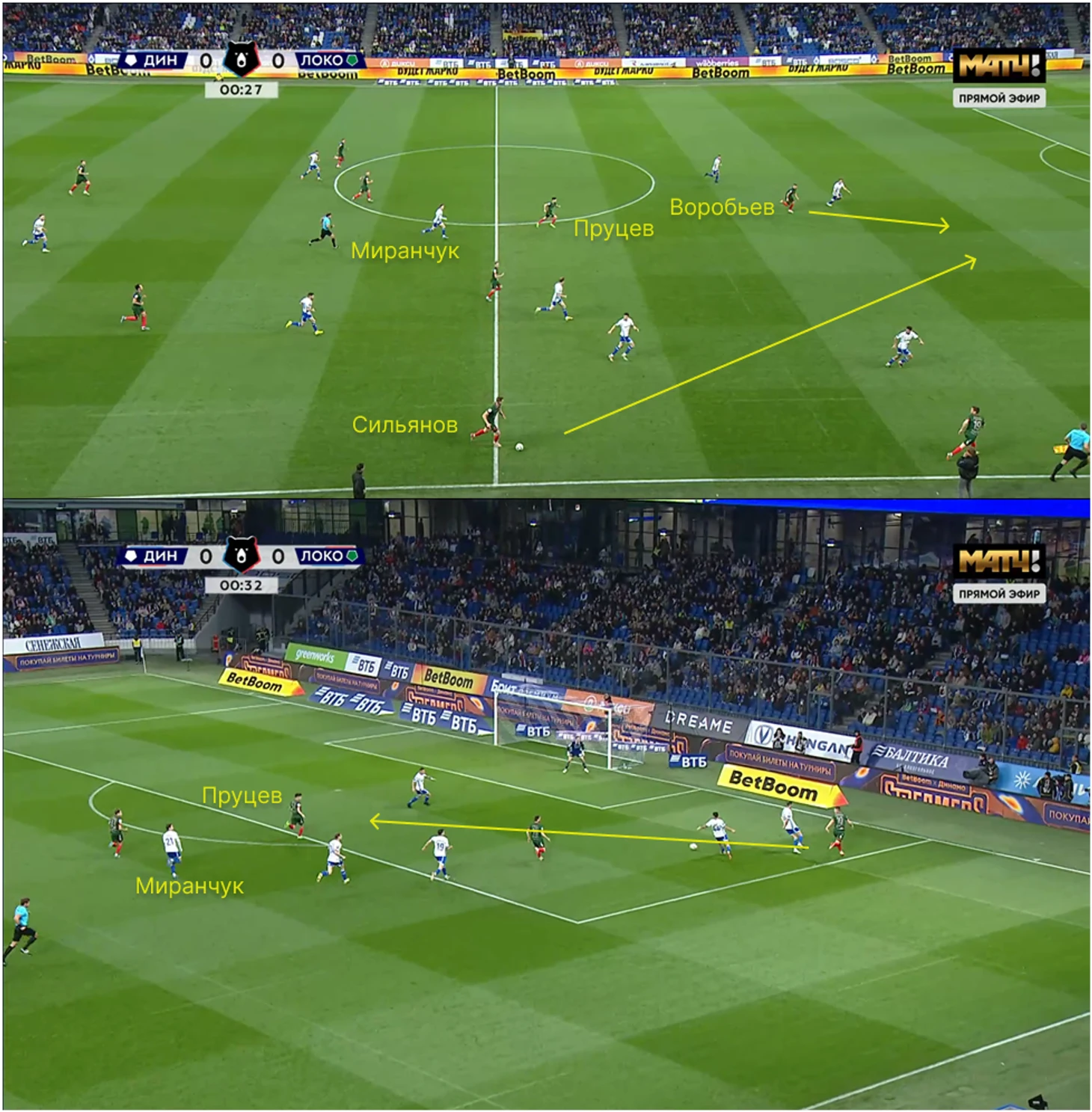 Во-первых, идея Галактионова с четверкой полузащитников наложилась на системную слабость динамовского прессинга. Идеальная иллюстрация – гол Данила Пруцева на 35-й секунде. Бахтиер Зайнутдинов поздно выдвинулся за Алексеем Батраковым. В итоге «Локо» легко разбил прессинг откатом на фланг на свободного Александра Сильянова.