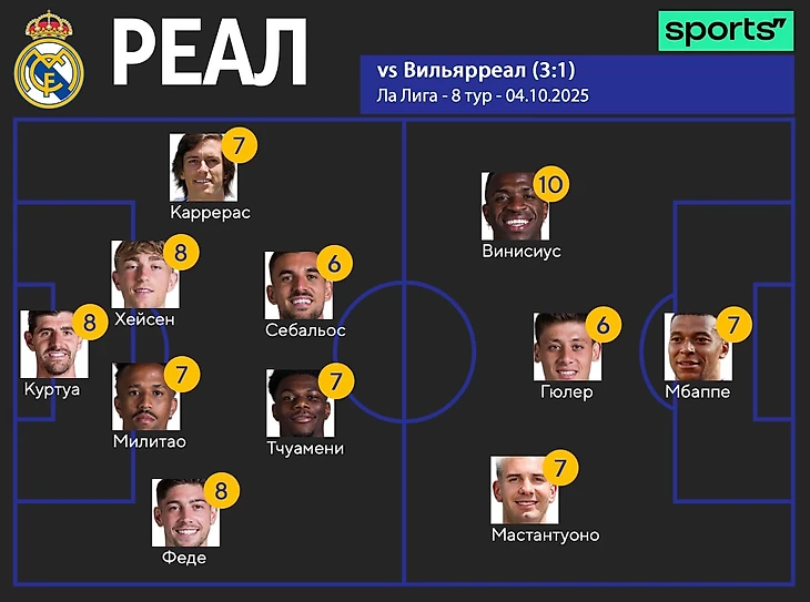 Винисиус Жуниор – 10. Все уже описано выше. Мы наконец-то увидели ту самую версию Винисиуса, которая была ужасом для любой обороны. Игроки «Вильярреала» просто не понимали, как его остановить. Потрясающий матч. Требуем продолжения!