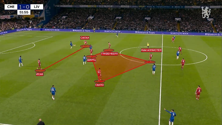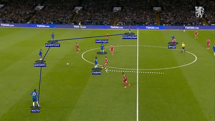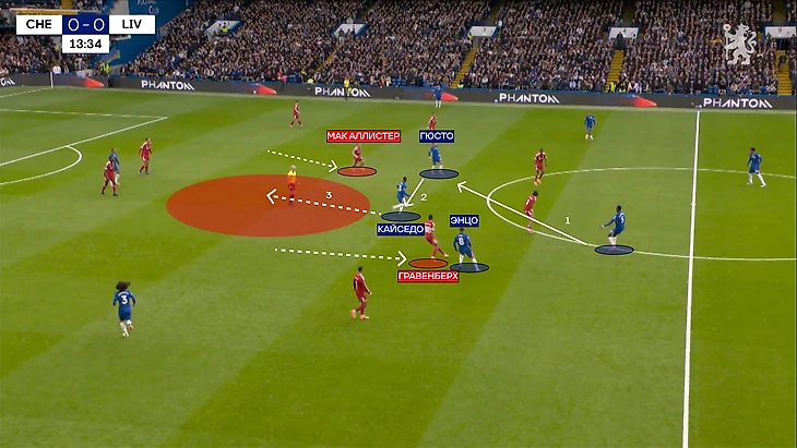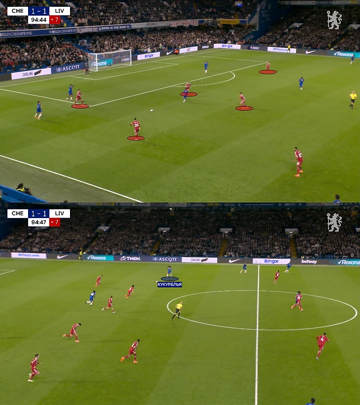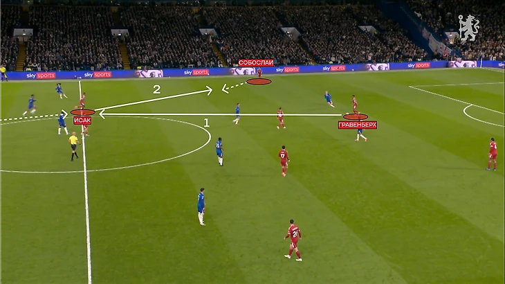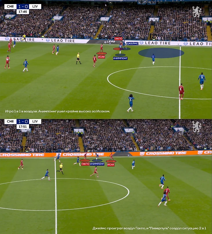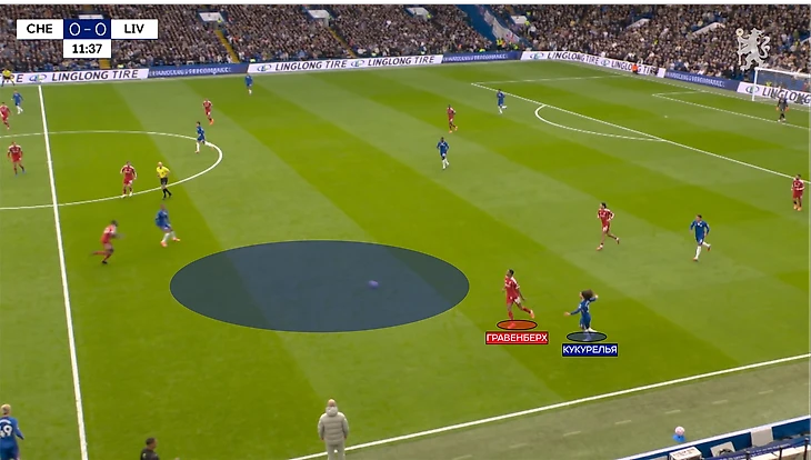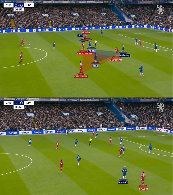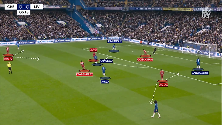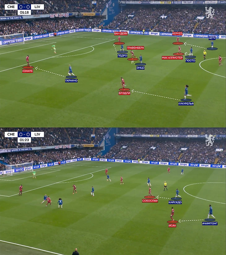 В этом матче «синие» поставили все на персональный прессинг в защите на чужой половине поля. Против билдапа «Ливерпуля» 4+1, «Челси» также выстроил блок из пяти футболистов. Но на этом персоналка н заканчивалась. До талого за Собослаи шел Кайседо, а за Исаком в первом тайме следил Ачимпонг. Вне кадра остались Салах и Гакпо, но по ним также персонально работали Джеймс и Бадиашиль.
