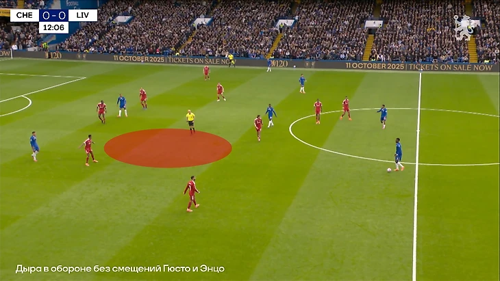 Отсутствие компактности и дыры в средней линии в позиционной обороне у «Ливерпуля» немного удивили. «Челси» проходил защитный блок соперника частыми смещениями в опорную зону от Энцо и Гюсто. Хотя, и без этого гости оставляли зоны. Ситуация до гола: