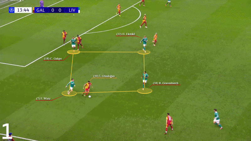 «Галатасарай» использовал другую стратегию. Они вынуждали пасовать на Гравенберха, одновременно исключая другие короткие варианты, чтобы затем наброситься на него и отобрать мяч. В приведенном ниже примере Илкай Гюндоган отклоняется в сторону, чтобы помешать Алиссону Беккеру отдать пас Ван Дейку, в то время как присутствие Виктора Осимхена мешает вратарю отдать пас на Конате или Собослаи. Гравенберх, казалось бы, открыт, но Лукас Торрейра прыгает на него, как только приходит пас, и выигрывает владение мячом, переправляя его Осимхену.