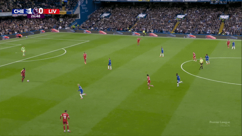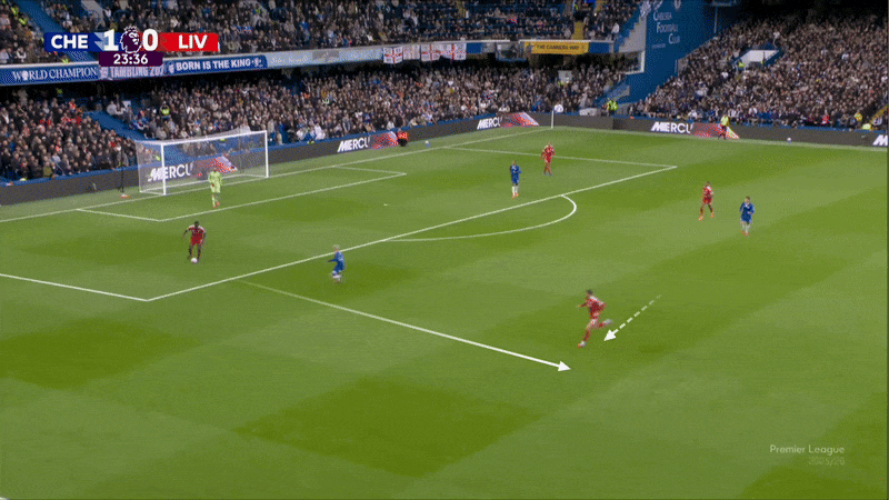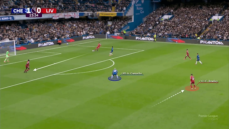 Центральный защитник колеблется и в конечном итоге отдает пас вбок, что разочаровывает венгра и Брэдли. Этот дуэт был в состоянии повторить прием, который «Ливерпуль» с успехом использовал в прошлом сезоне: Кукурелья выскочил вверх в поле, оставив тройку нападающих против трех защитников «Челси», к которым присоединился и Керкез.