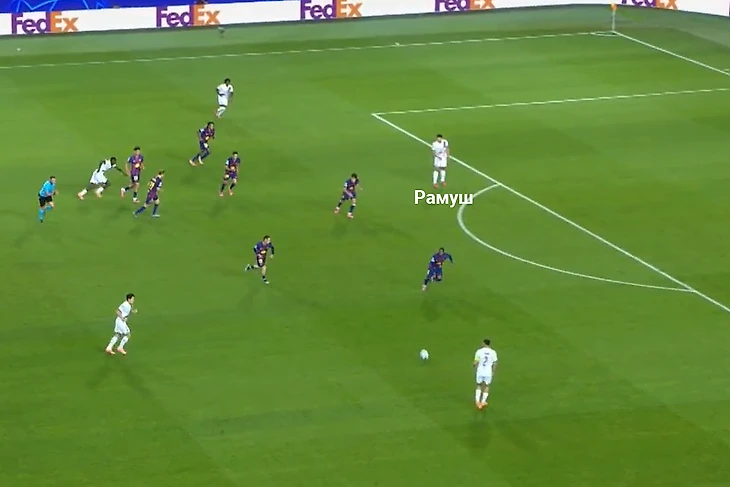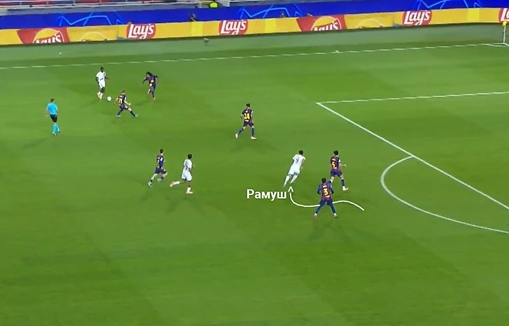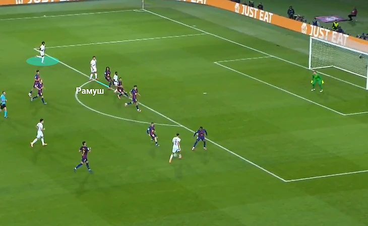 Для таких движений, как на скриншотах выше, высокая линия обороны Барсы только на руку Рамушу. Португалец может аккуратно выходить из «вне игры» и незаметно выскакивать перед лицом оппонента.