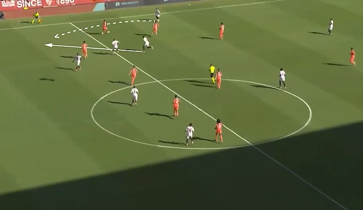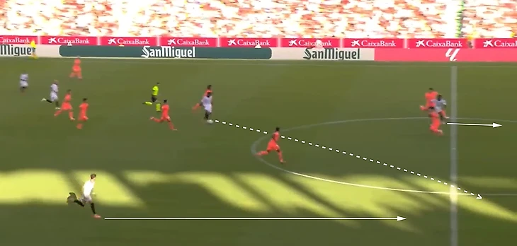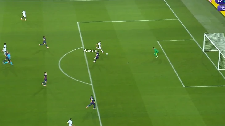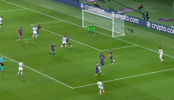 Так, Райо ловил линию обороны Барсы на встречном шаге: защитники делали искусственный офсайд, делая шаг вперед, а соперник набирал скорость из глубины (не из офсайда). При этом нападающий при простреле получал преимущество, как на скрине