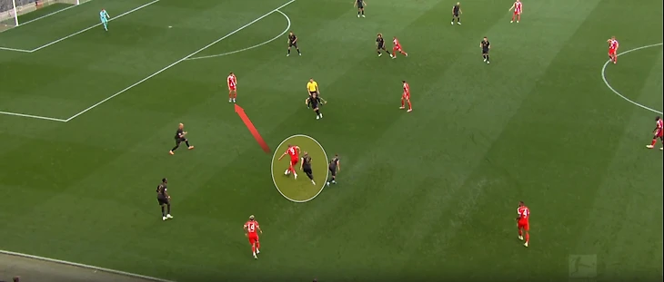Кейн спускается на свою половину, если соперник идет в прессинг. Через Харри «Бавария» запросто разворачивает атаки с одного фланга на другой. Кейн легко ставит корпус и дает темповые передачи.