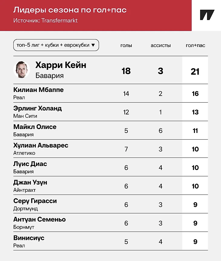 И еще один бесконечно важный фактор: «Бавария» лучше использует Кейна, качественнее обрамляет спуски Харри в глубину поля. В прошлом сезоне возникал резонный вопрос: не слишком ли часто Харри уходит из штрафной соперника? «Баварии» не хватало угрозы внутри штрафной, Кейн не успевал добежать в убойную зону после стенок в центре поля. Напоминание: Патрик Шик в Бундеслиге-2024/25 забил больше голов без учета пенальти, чем Кейн.