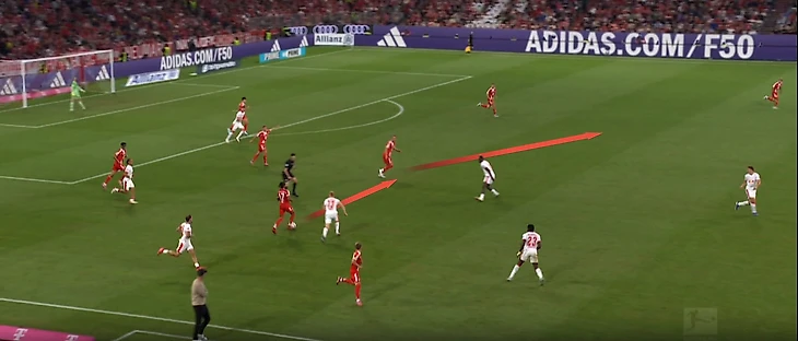 Он вырезал отличный навес, разогнал несколько контратак, много действовал в оттяжке, связывая полузащиту и атаку. За Кейном постоянно шел Джеффри Гауэлеу, из-за чего в центре защиты возникала дыра, которой пользовались абсолютно разные игроки «Баварии»: от Луиса Диаса до левого защитника Йосипа Станишича.