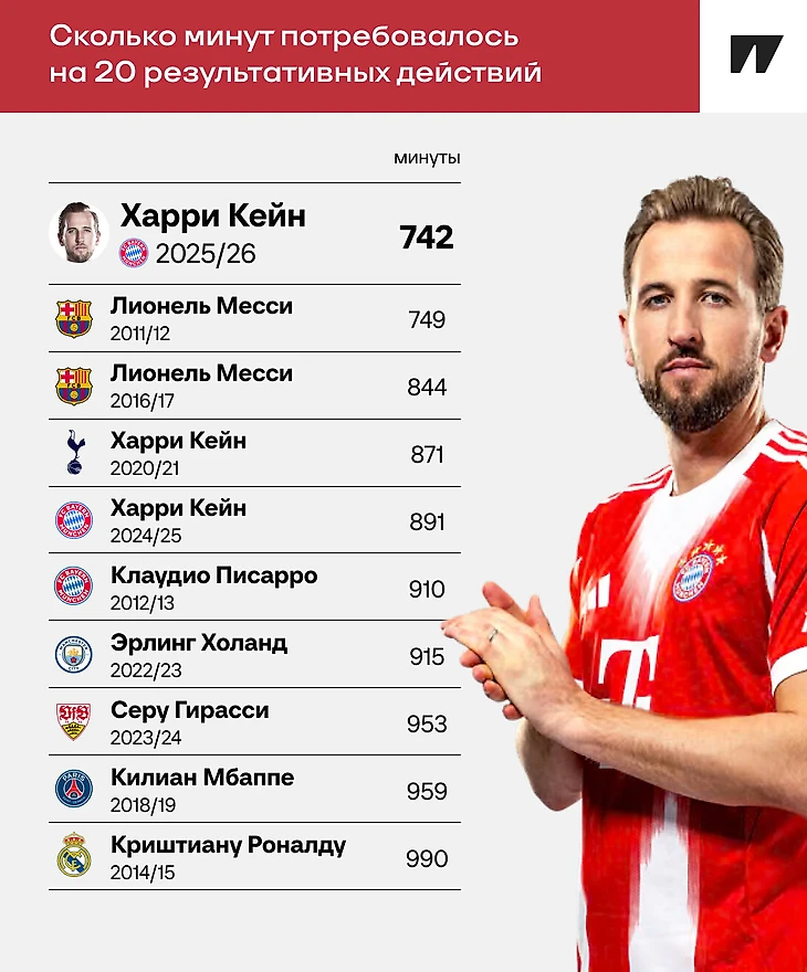 Кейн идет в темпе, который позволяет ему соперничать с вечностью, а не с сегодняшними соперниками. На 20 результативных действий за «Баварию» Харри понадобилось рекордные 742 минуты. Даже Лионель Месси в безумном сезоне-2011/12, когда в итоге набрал больше сотни очков по гол+пас, стартовал чуть-чуть скромнее. Кстати, Кейн и Месси начинают сезоны лучше всех в мире.