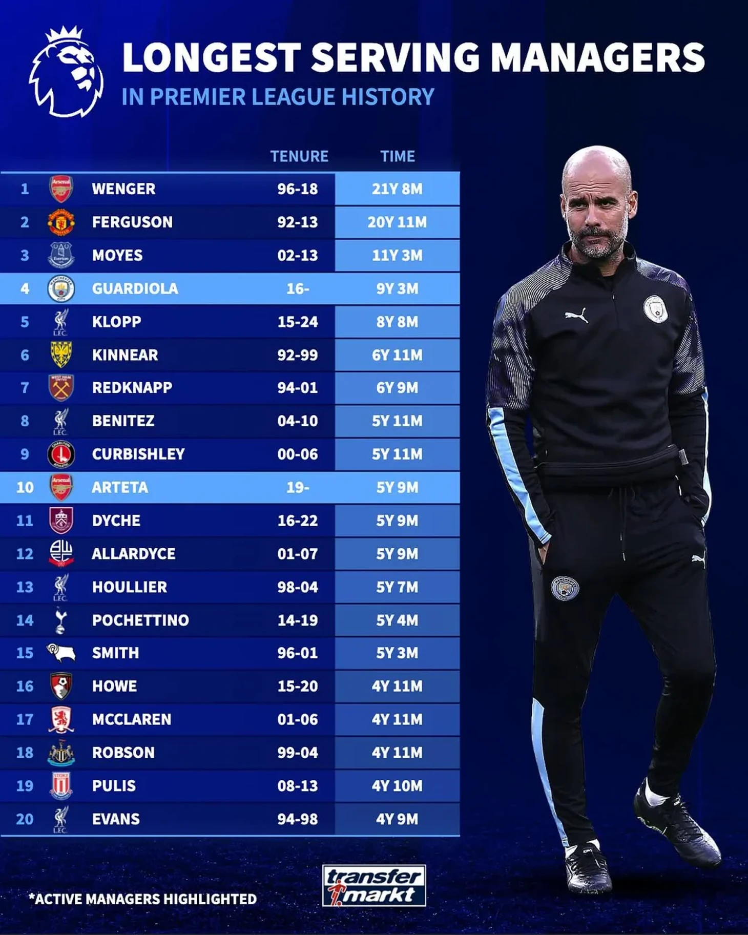 Transfermarkt выкатил таблицу, состоящую из двадцати самых длительных тренерских работ за время существования АПЛ.