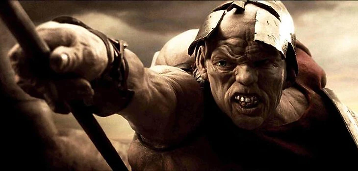 Когда одному из спартанцев удается сбить маску с противника, оказывается, что под ней все-таки есть лицо – мертвецки бледное, будто бы вампирское. Вместе с «Бессмертными» в битву вступает клыкастый полуголый великан, чье тело испещрено шрамами. Его выводят в цепях, и он нечеловечески рычит. В этой роли снялся канадский рестлер Робер Майе, выступавший в промоушене WWF под псевдонимом Куррган, который он выбрал под влиянием фильма «Горец», где почти так же зовут жестокого противника Коннора Маклауда.