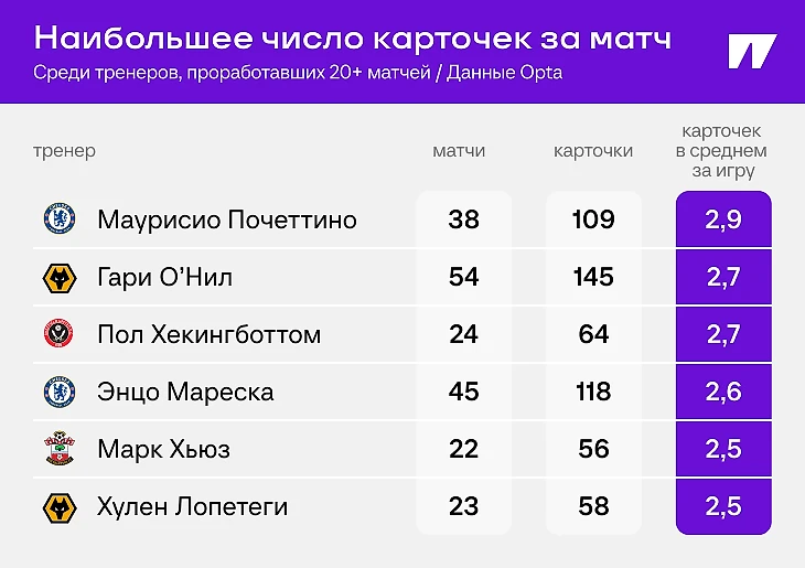 Проблема не новая: при Маурисио Почеттино «Челси» побил рекорд по желтым карточкам за сезон (103) и карточкам в целом (107). Предыдущий рекорд принадлежал «Лидсу»: в сезоне-2021/22 команда Марсело Бьелсы собрала 101 желтую.