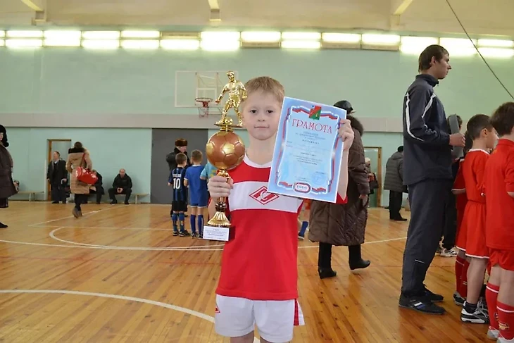 «Это просто детская фотография. Может быть, создатель команды, болельщик («Спартака»). Это в Старом Осколе, там был СДЮШОР «Спартак» или как-то так назывался, я за них начинал. Это первое место, в которое я просто пришел, там секция была. Я пятилетний был, ребята были все семилетние. И вот был тренер Александр Васильевич, он не хотел меня брать, потому что я самый маленький был, но потом говорит: «Ладно, возьму». И вот форму «Спартака» дали.