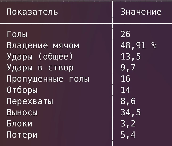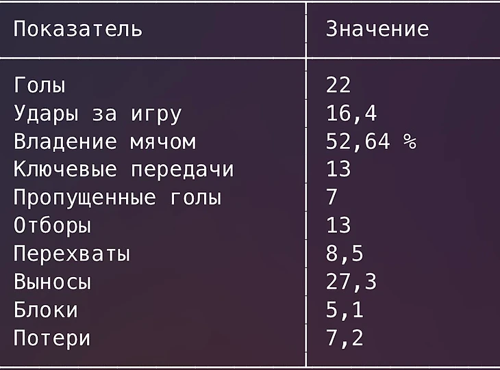 Разобравшись в статистике по каждой команде можно сделать краткие выводы . Легко увидеть слабые и сильные стороны . Пора признать, что цифры-неотъемлемая часть успеха.