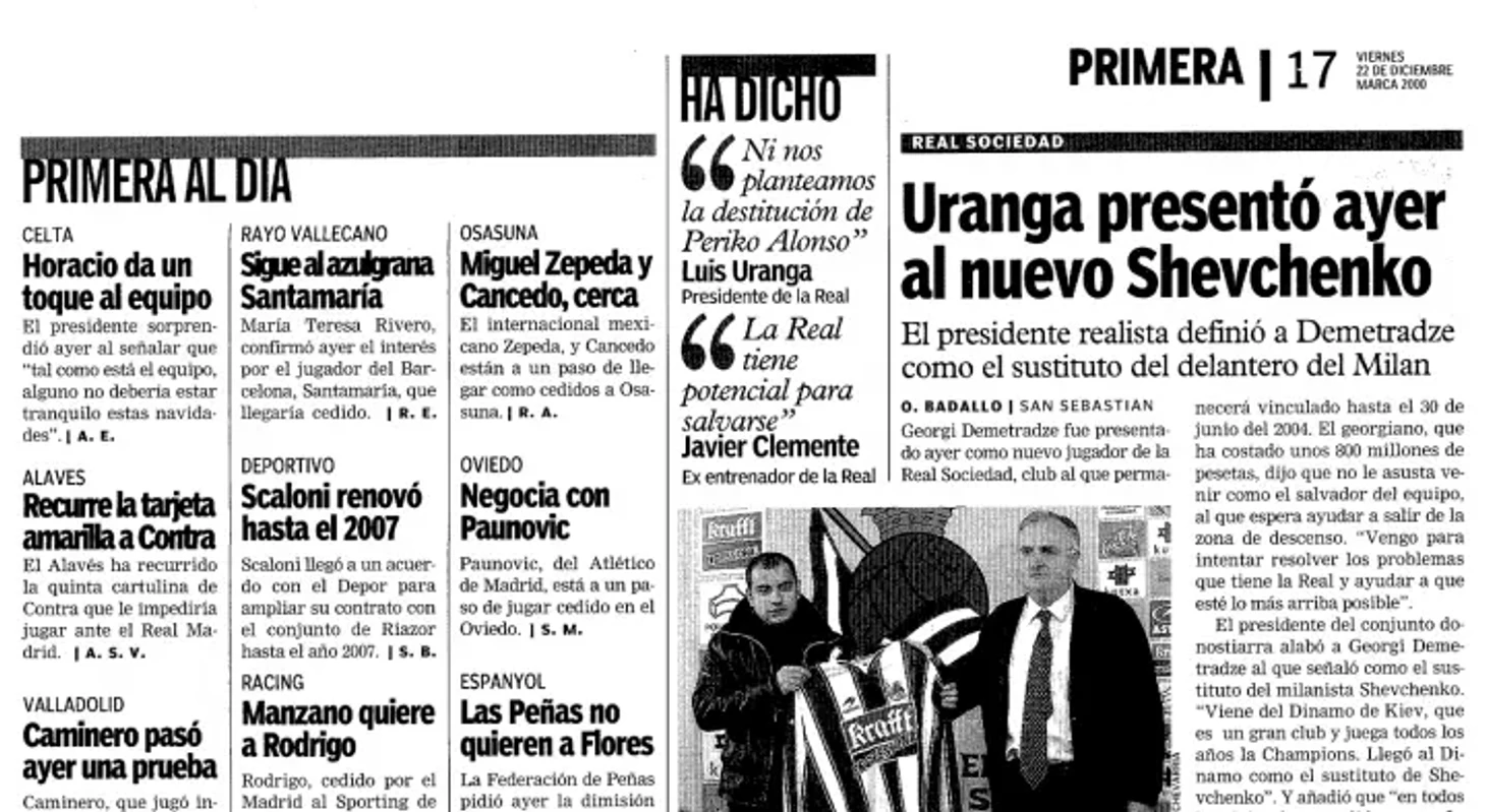 Деметрадзе — первый грузин в Ла Лиге. Зимой 2000 года «Реал Сосьедад» занимал последнее место в таблице. Пять туров без побед, четыре поражения подряд, и на посту главного тренера остался Перико Алонсо, отец Хаби Алонсо, который в том сезоне дебютировал в Примере в 18 лет. На помощь приходил Джон Тошак, команда которого начинала сезон под руководством Хавьера Клементе.