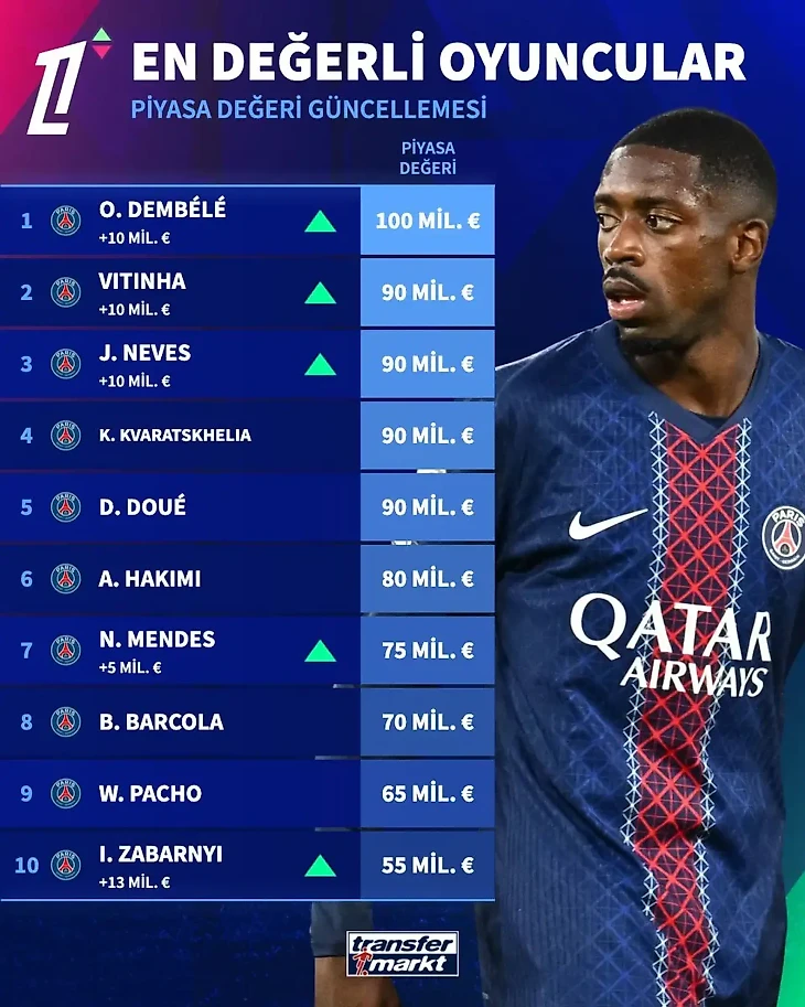Следом идут Витинья и Жоау Невеш — оба оцениваются в €90 млн. Ту же сумму имеют Хвича Кварацхелия и Дезире Дуе, замыкая топ-5 самых дорогих игроков парижан
