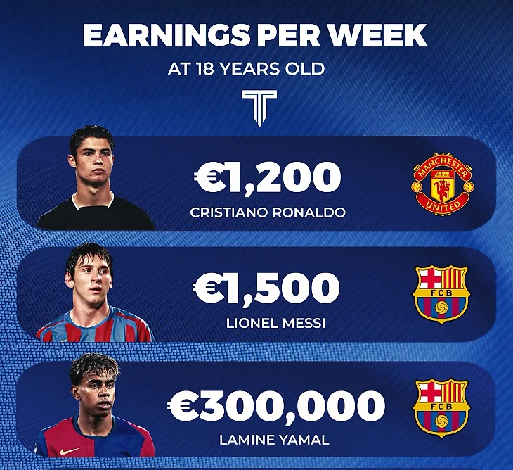 💰 Сравнили зарплаты 18-летних Ямаля, Месси и Роналду. Ох...