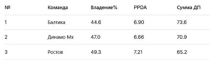 Далее список команд, которые много владеют мячом, активно прессингуют соперника (низкий PPDA) и предпочитают контролировать мяч через короткий и средний пас, что подтверждается низкой суммой длинных передач. Это команды, которые стремятся полностью контролировать игру.