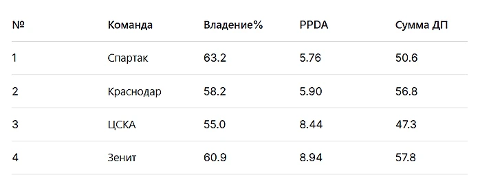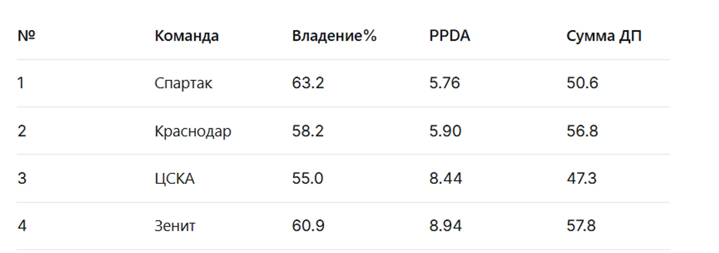 По последнем списку стоить отметить, что если «Спартак» и «Краснодар» используют интенсивный прессинг, то «Зенит» и ЦСКА чередуют прессинг с игрой в среднем и низком блоке.