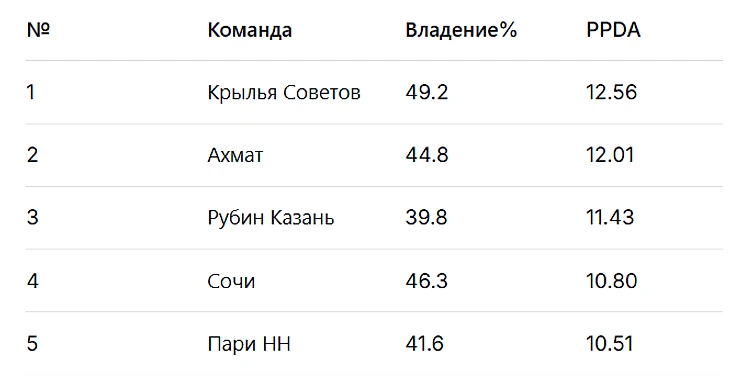 Следующие команды практикуют прямолинейный футбол: они мало владеют мячом, но компенсируют это активным отбором (низкий PPDA) и немедленным переводом игры вперед с помощью длинных передач.