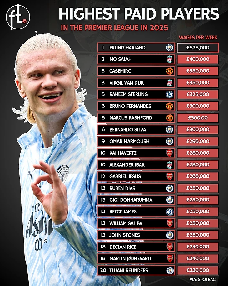 Лидером единолично оказался Эрлинг Холанд, от «Ман Сити» норвежец еженедельно получает 525 тысяч фунтов стерлингов до вычета налогов. Еженедельная зарплата Мо Салаха меньше на 125 тысяч фунтов. Третье место разделили Каземиро и Вирджил ван Дейк – оба в неделю получает 350 тысяч фунтов.