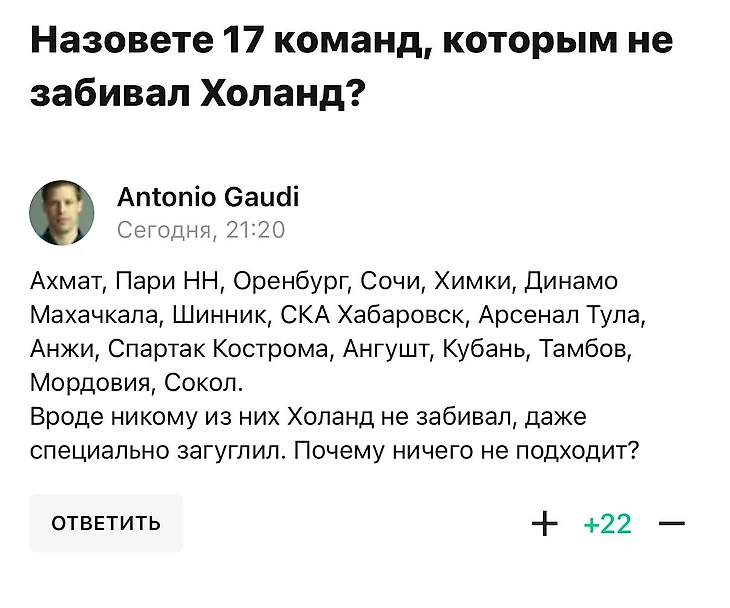 У нас вышел тест о командах, которым не забивал Эрлинг Холанд. Самый популярный коммент оставил Antonio Gaudi: 16 российских клубов с расчетом, что Холанд против них не играл, поэтому и голов не было.