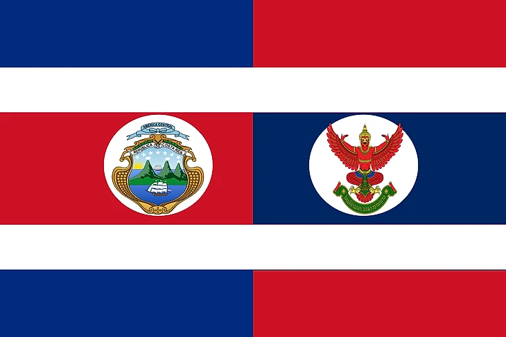 Если сборную Коста-Рики мы неоднократно видели на ЧМ, то в случае с Таиландом наоборот: азиатская сборная никогда в своей истории туда не пробивалась. Зато флаг у Таиланда яркий: он практически идентичен костариканскому. Общая полоса - белая; осталась без изменений, а центральная и крайние горизонтальные отличны друг от друга: у тайцев крайние красного цвета, у К-Р наоборот - синие. Также и с центральной: красная у «Лос Тикос», синяя - у азиатской сборной.