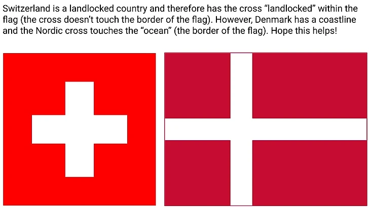 Швейцария же во многом стала родиной Красного Креста, который перекочевал в медицину. Именно ее флаг послужил прообразом символа медиков; они просто сменили гамму на швейцарском флаге. Дания в большей степени взяла крест будучи одной из хранительниц викинг-наследия, наряду со Швецией, Норвегией и Исландией, включив заодно и Фареры.